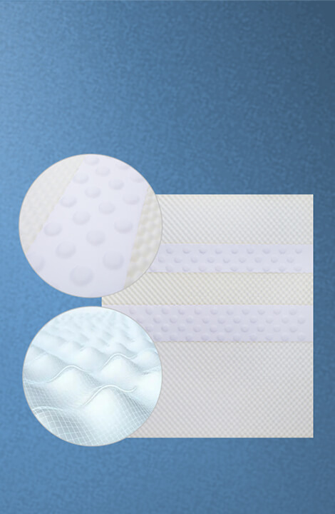 81个波点太空树脂球+约2150个蛋形波浪绵将床垫 舒适层划分成不同舒缓程度的三区五段设计,根据 身体不同部位匹配相应轻微指压按摩触感。